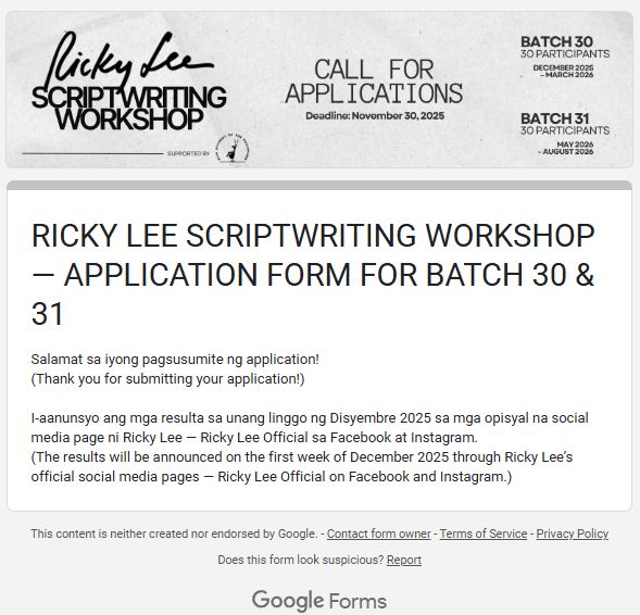 I wish to attend the workshop because I want to learn about scriptwriting and the best practices to apply the life experiences through the script. So far, I am only able to creatively write these sensibilities through the essays I publish in my personal blog, and do some letter-writing to an imaginary person to expand whatever I have in my mind.