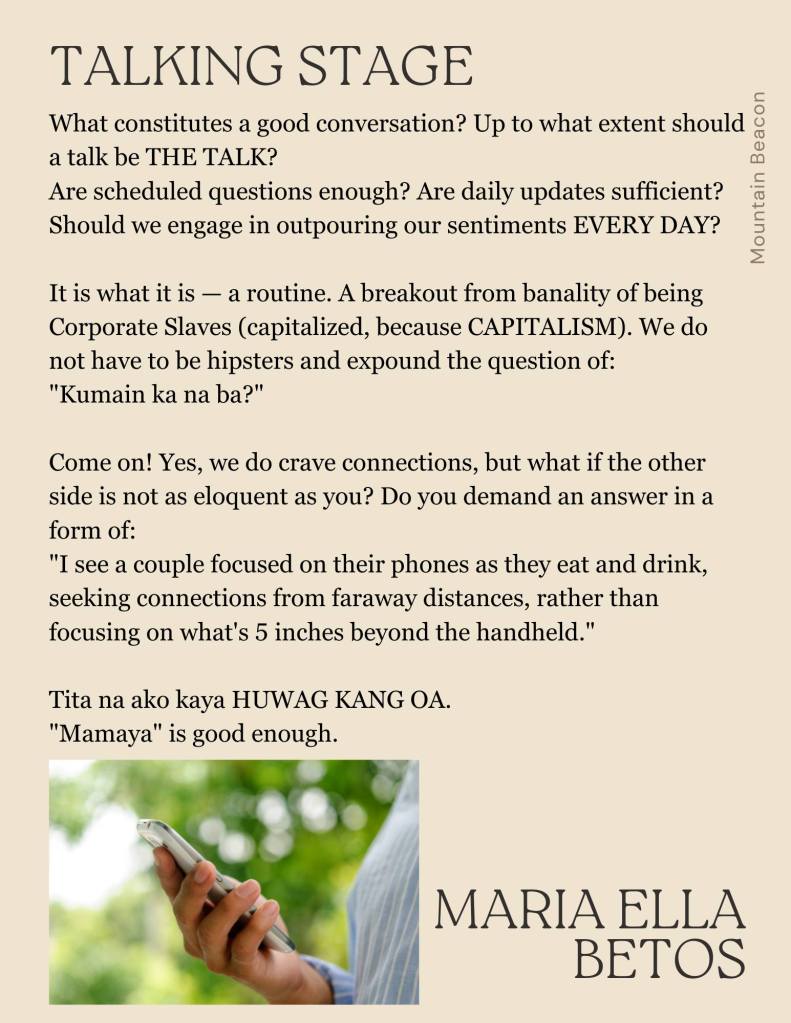 Magmi-makeup ako mamaya. Light lang. Para matakpan ‘yung pasa sa ilalim ng mata. ‘Yung gasgas sa labi. Sa counter, babati ako ng, “Ma’am, may card po kayo?” kahit ang gusto ko talagang itanong ay, “Ma’am, may pakialam po ba kayo?”